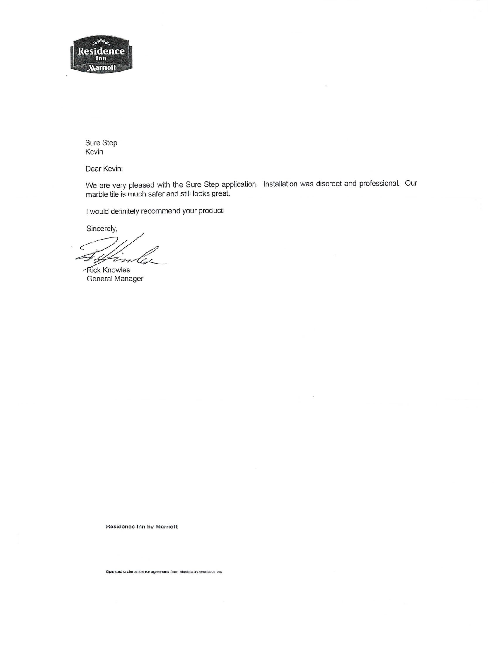 "We are very pleased with the Sure Step application. Installation was discreet and professional. Our marble tile is much safer and still looks great."